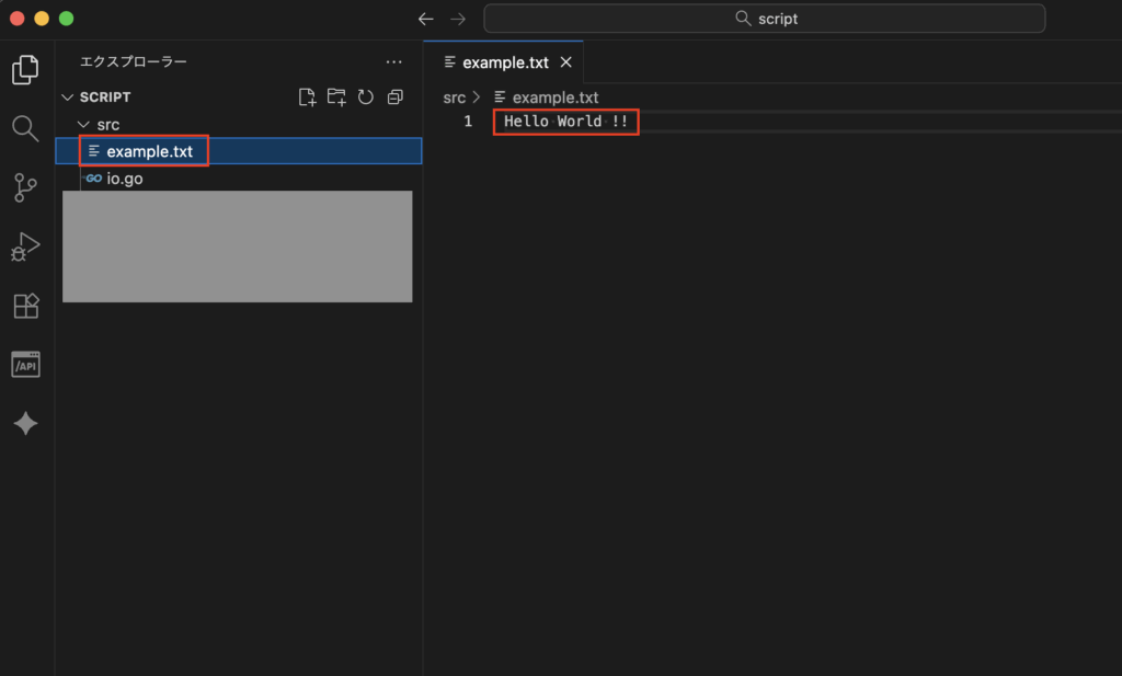 ※テキストファイル「example.txt」が作成され、ファイルに文字列「Hello World !!」が書き込まれていること。