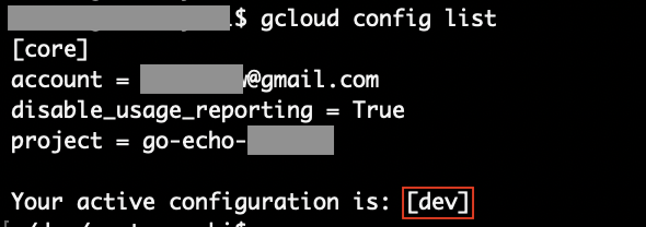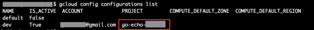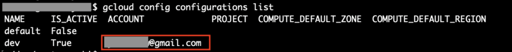 コマンド実行後、構成名「dev」のACCOUNTにログインしたGoogleアカウントが設定されていればOKです。