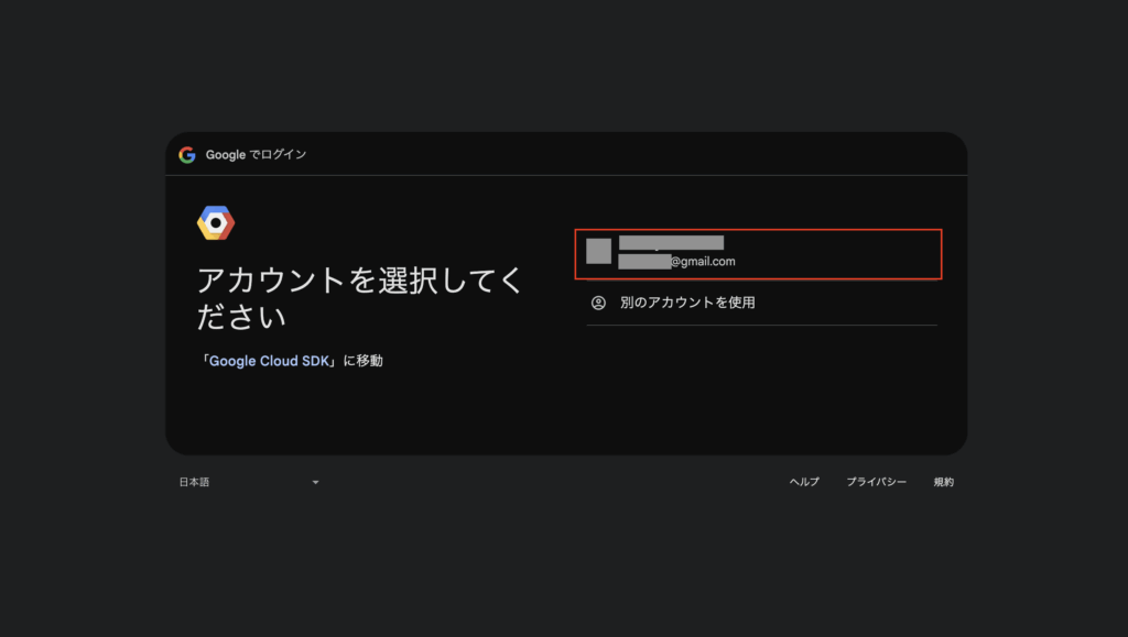 次に以下のコマンドを実行し、Googleアカウントにログインします。