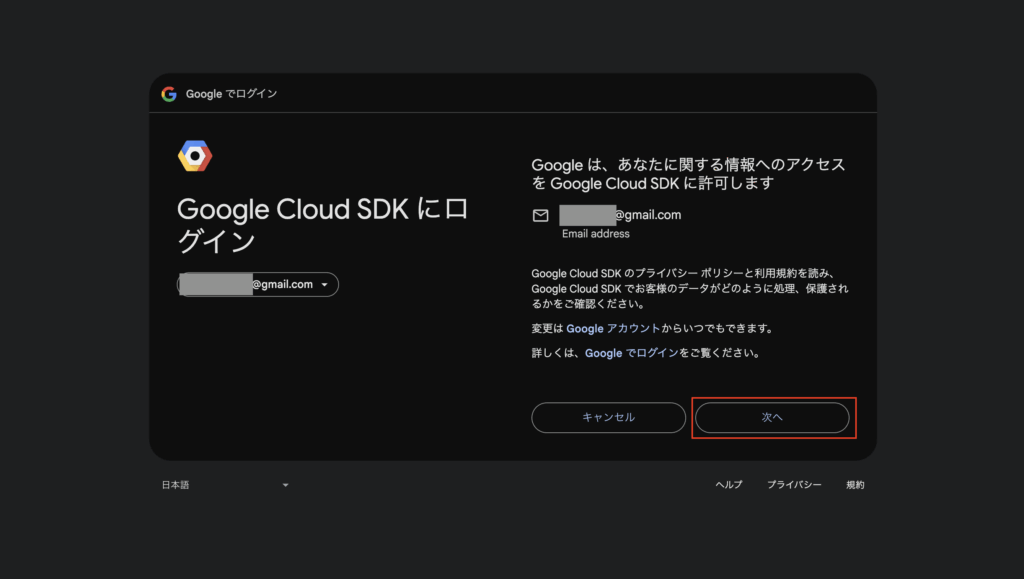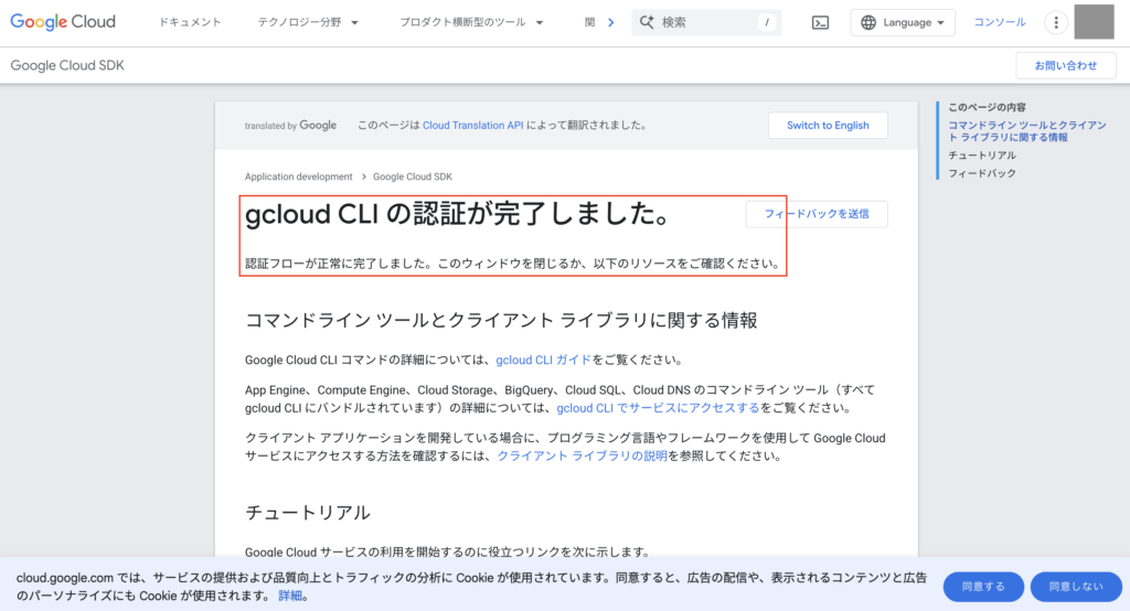 許可した後に「gcloud CLIの認証が完了しました。」の画面が表示されればOKです。