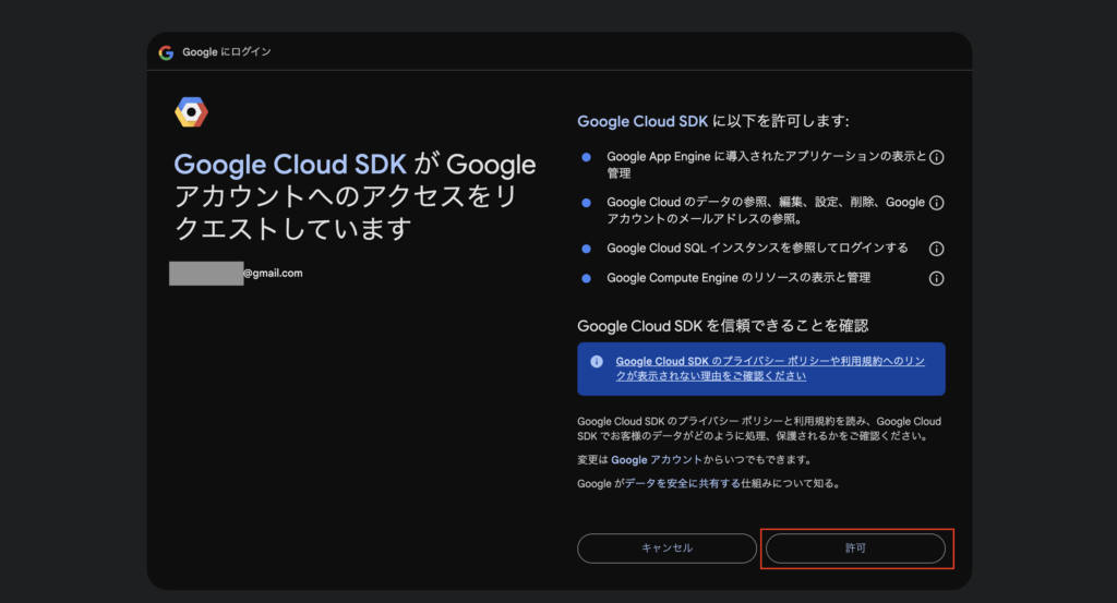 次にGoogle Cloud SDKの許可について記載があるので確認し、問題なければ画面下の「許可」をクリックします。