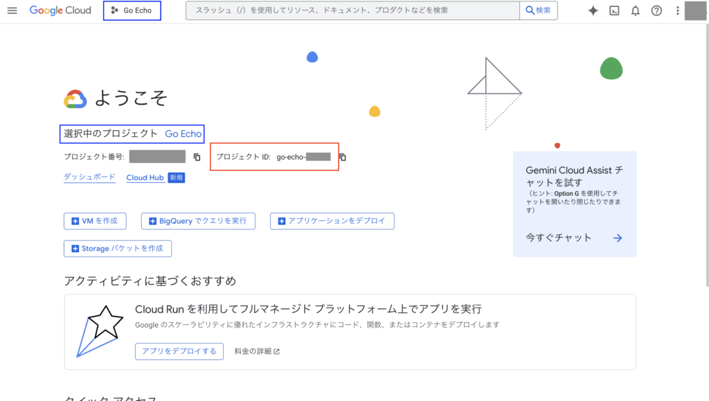 次に構成に対象のプロジェクトIDも設定するため、事前にGoogle Cloudのコンソールなどから対象のプロジェクトのプロジェクトIDを確認して下さい。