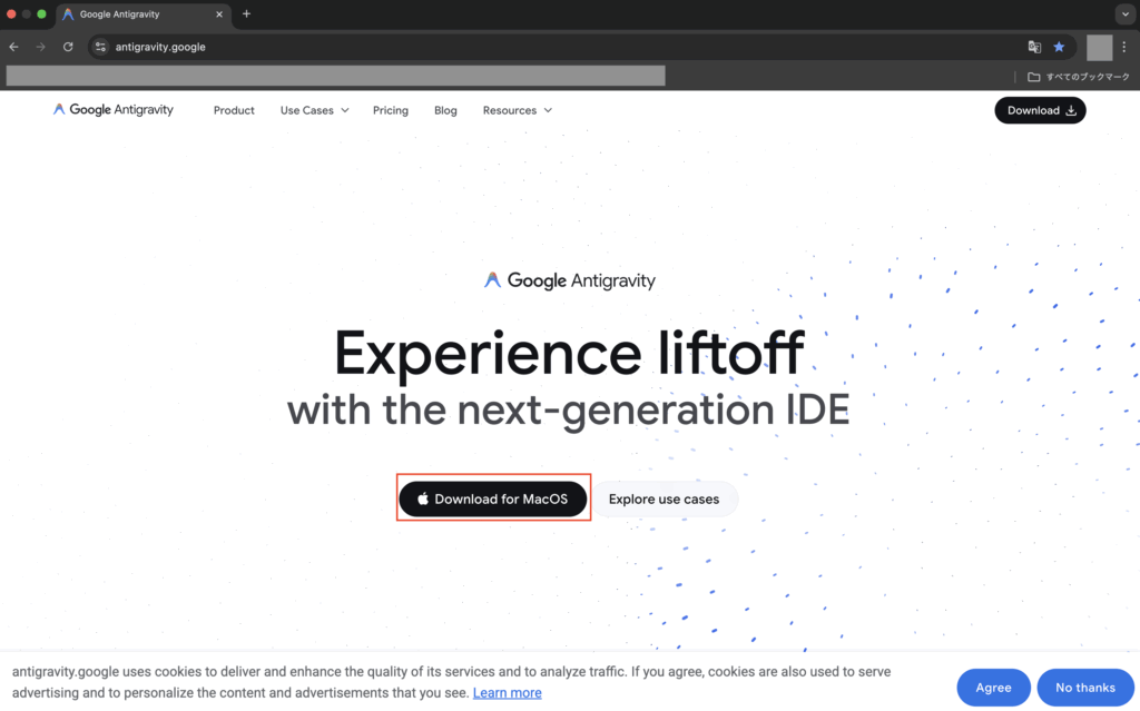 ではGoogle Antigravityの公式サイトにアクセスし、「Download for MacOS」をクリックします。