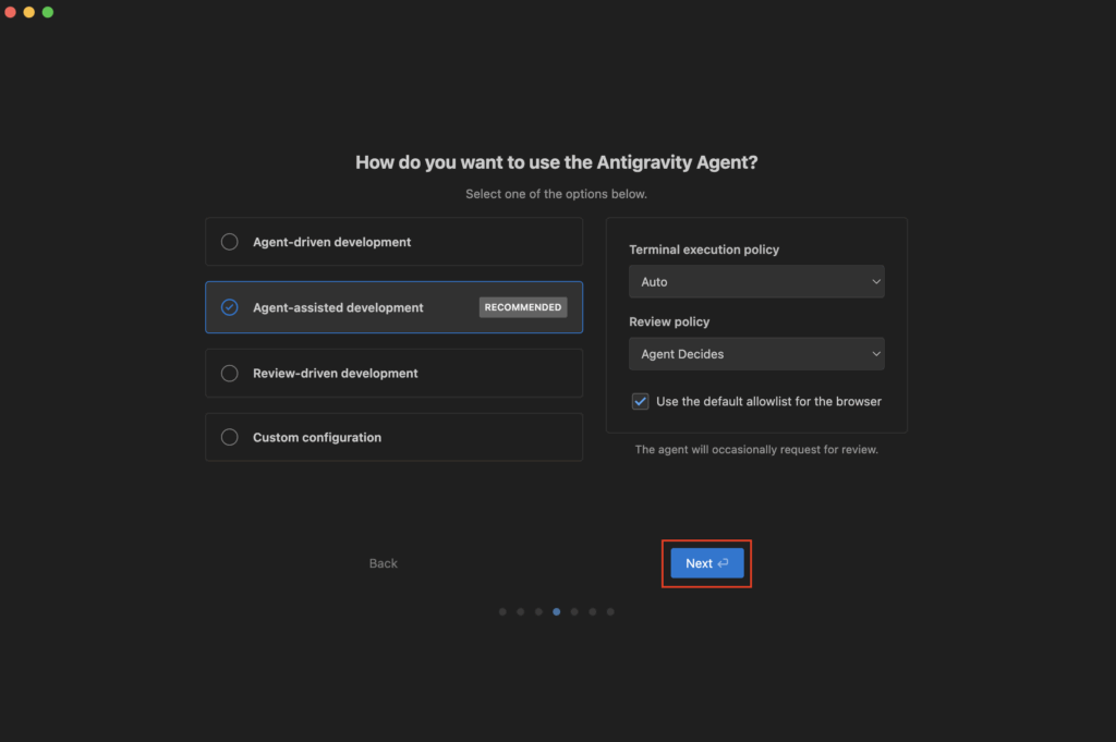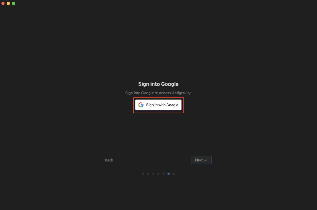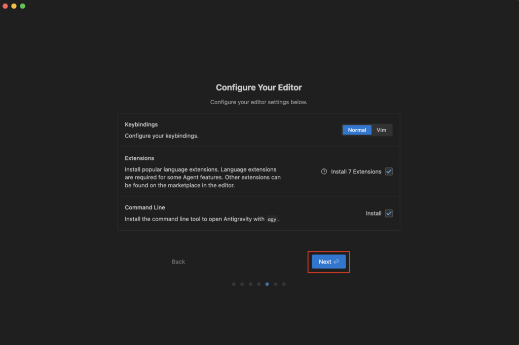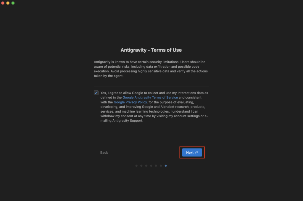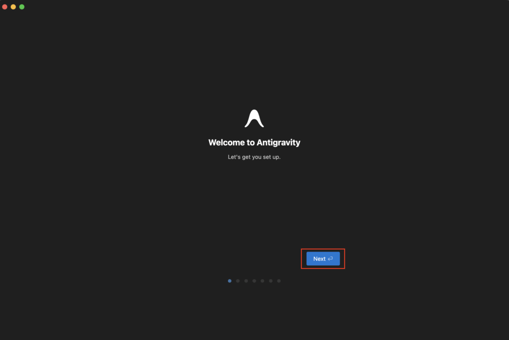 次にインストールしたアプリ「Antigravity」開くと、以下のような画面が起動するため、「Next」をクリックします。
