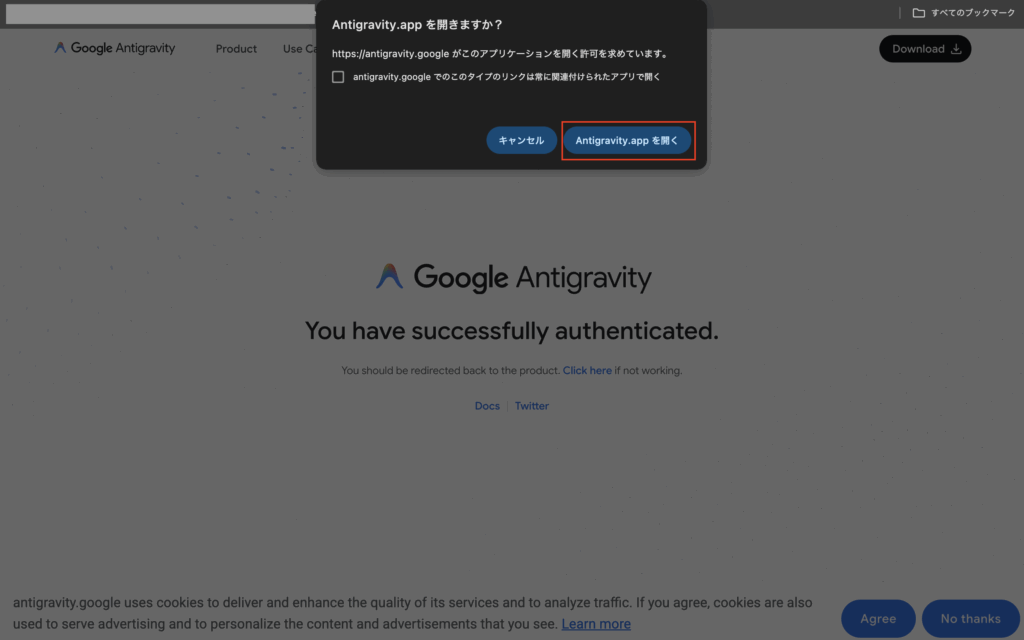 次にポップアップが表示されるので、「Antigravity.app を開く」をクリックします。