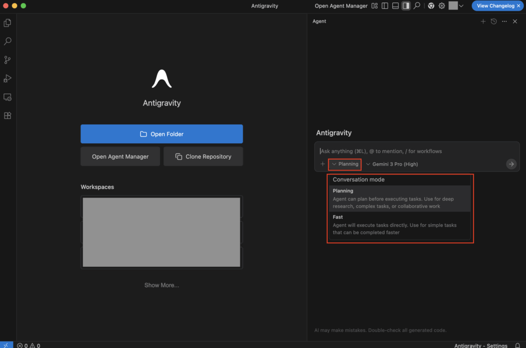 AntigravityではAIモデルや会話モードの切り替えが可能になっていますが、画面右側のAgentタブの入力欄の下にある「Gemini 3 Pro (High)」からリストを開き、AIモデルの切り替えが可能です。