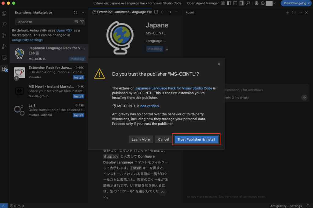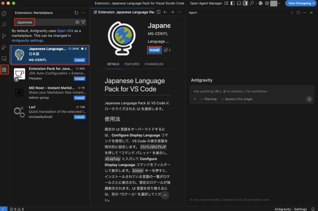 Antigravityはもちろん英語のツールですが、VSCodeのフォークのため、VSCodeの拡張機能「Japanese Language Pack for VS Code」を使えば日本語化も可能です。
