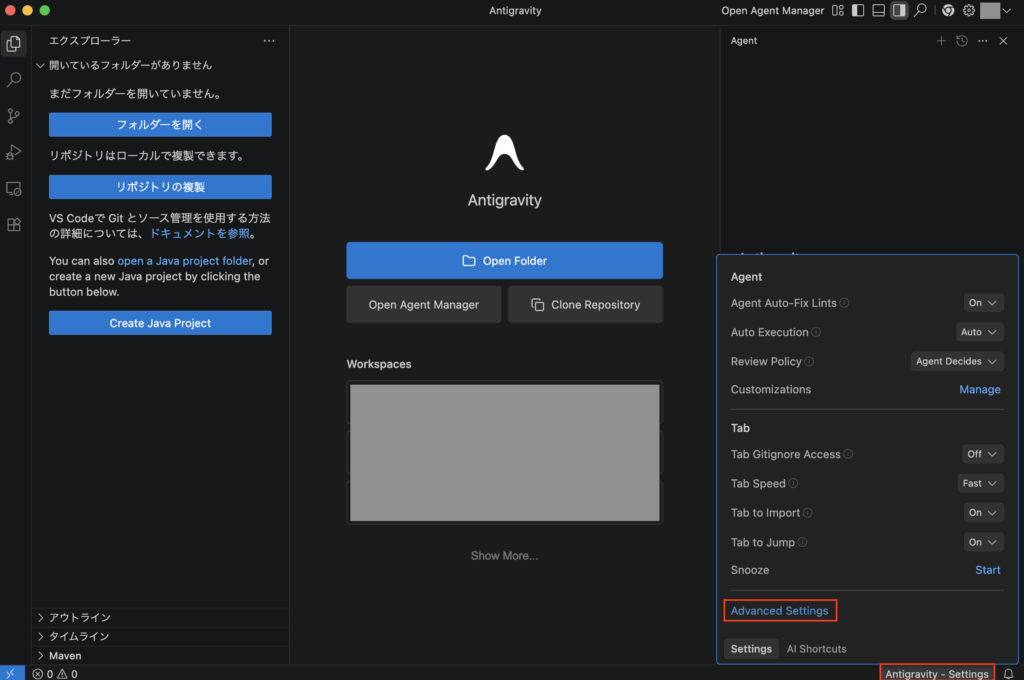 AIエディタを実務で使う場合、入力内容を生成AIモデルの学習に使われないようにする設定をするのは必須ですが、それに関する設定を変更したい場合は、画面右下の「Antigravity – Settings」からメニューを開き、「Advanced Settings」をクリックします。