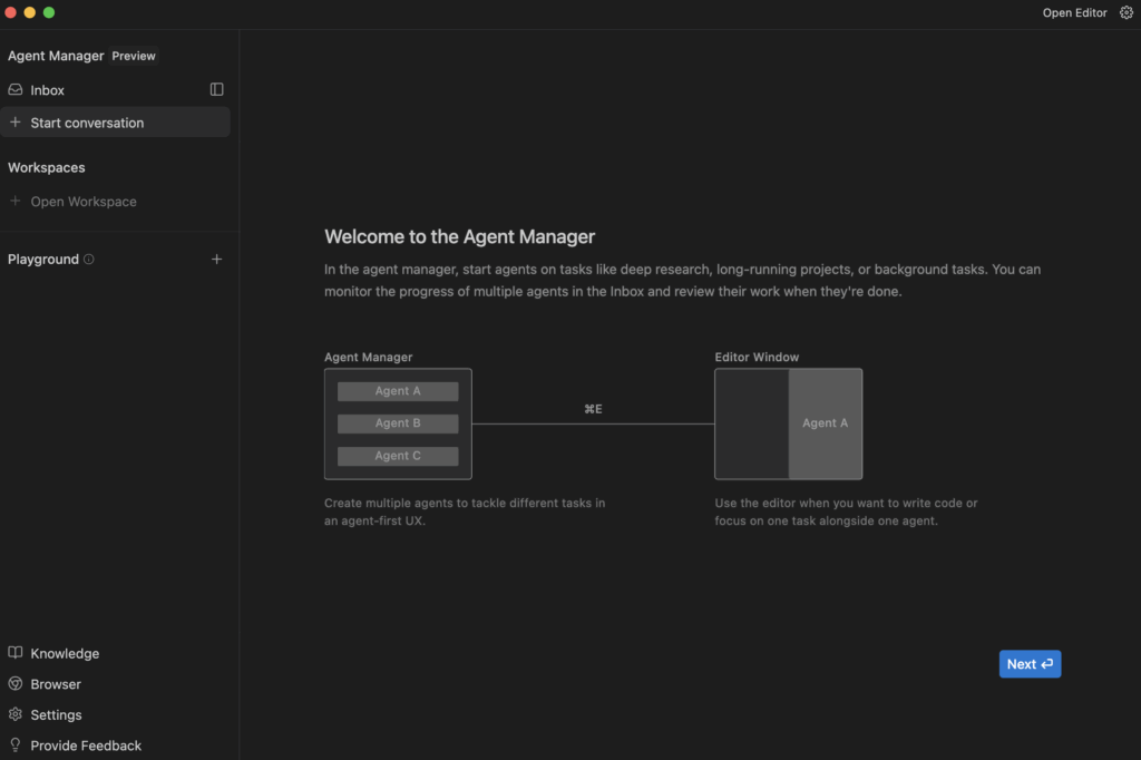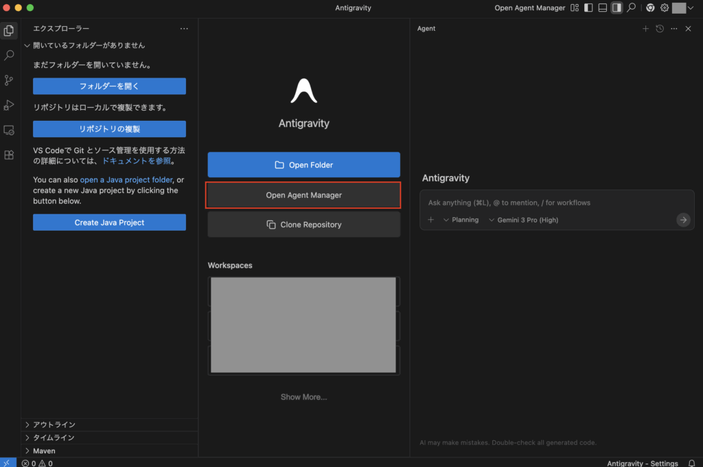 「Agent Manager」機能を使いたい場合は、画面中央の「Open Agent Manager」をクリックします。