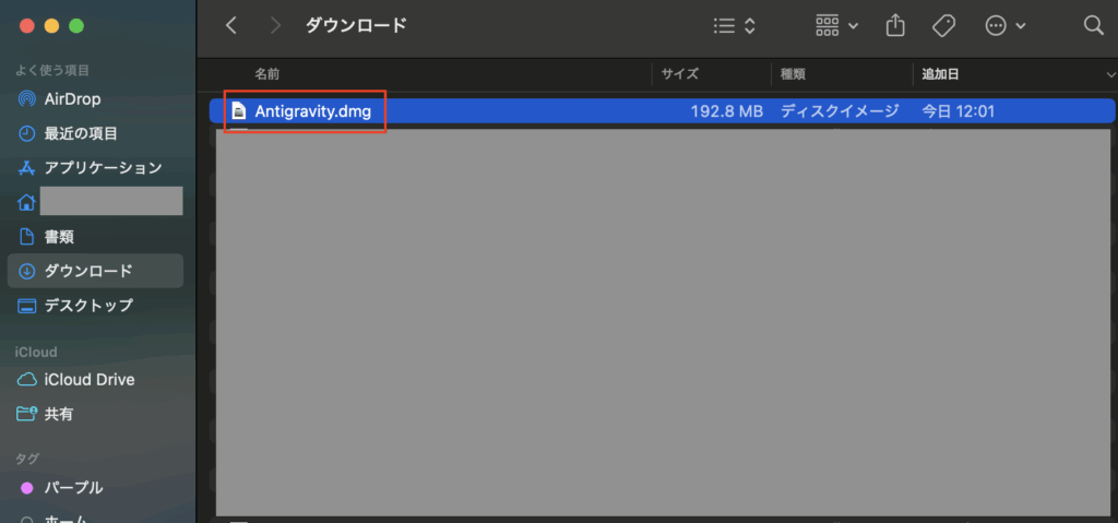 次にダウンロードしたファイル「Antigravity.dmg」をダブルクリックして開きます。