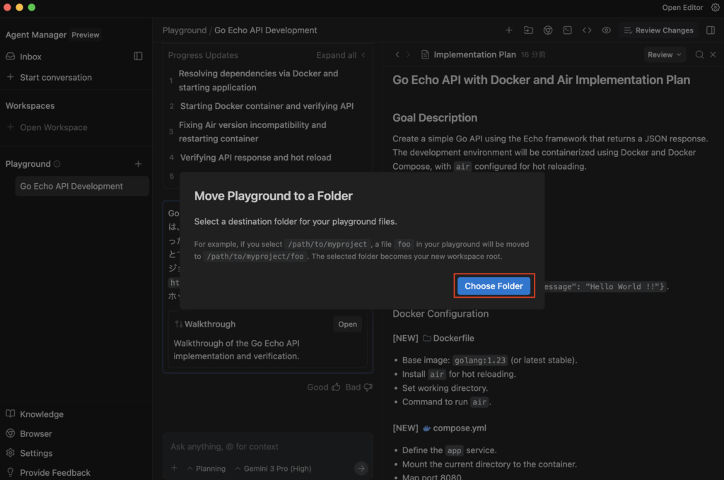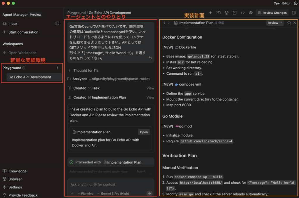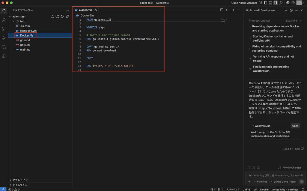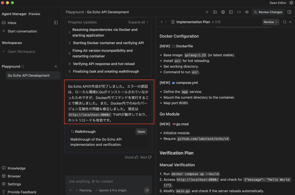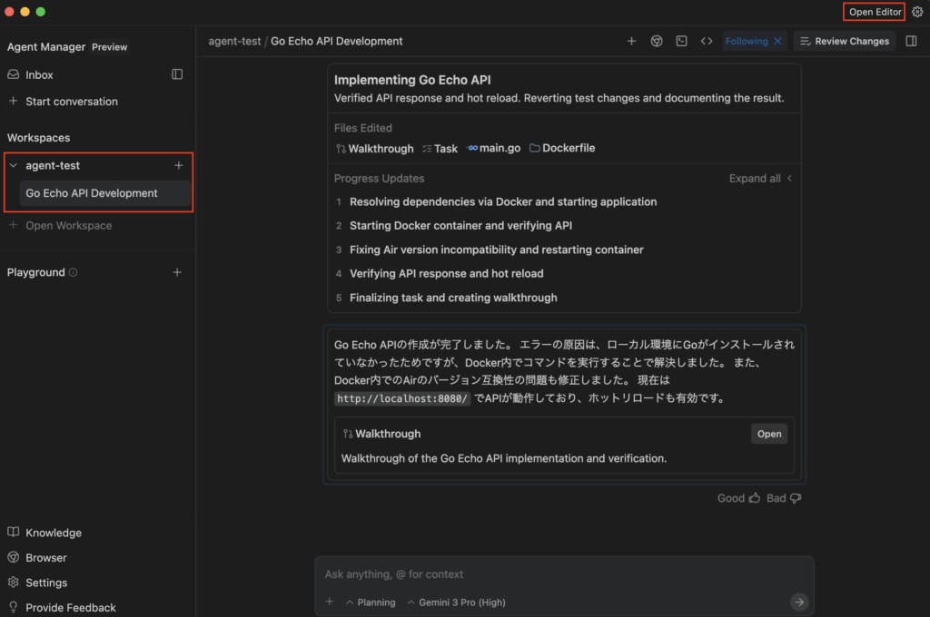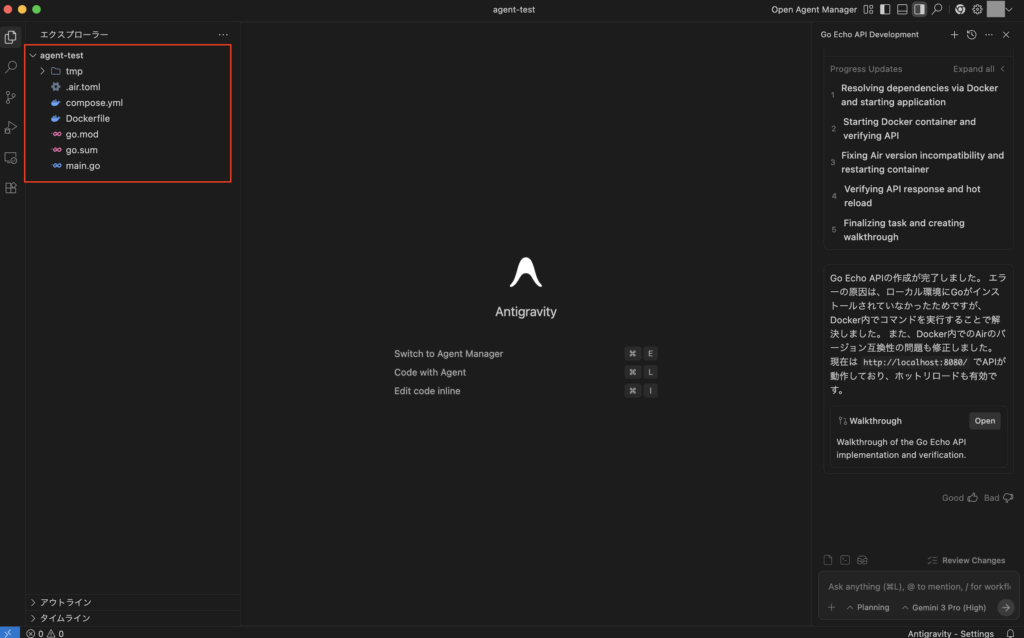 では試しにAgent Managerを利用してGo言語のechoでAPIを作ってみます。