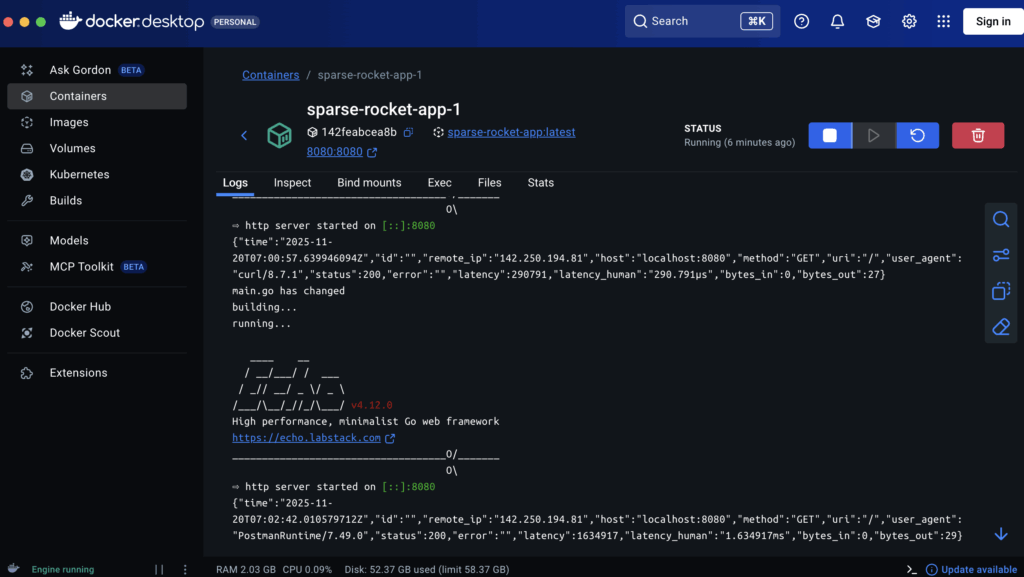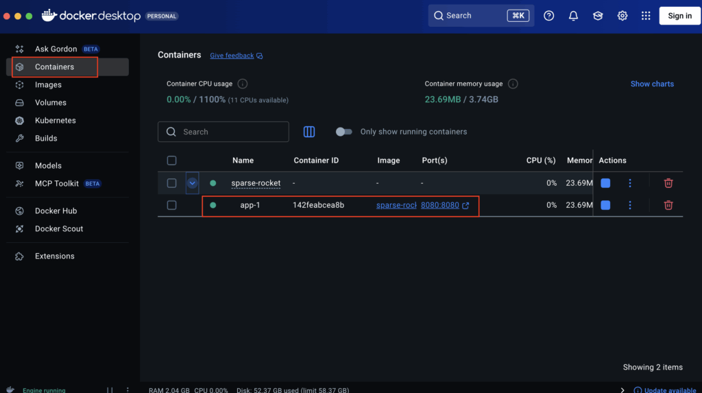 試しにDocker Desktopを確認すると、コンテナが作成されて起動してました。