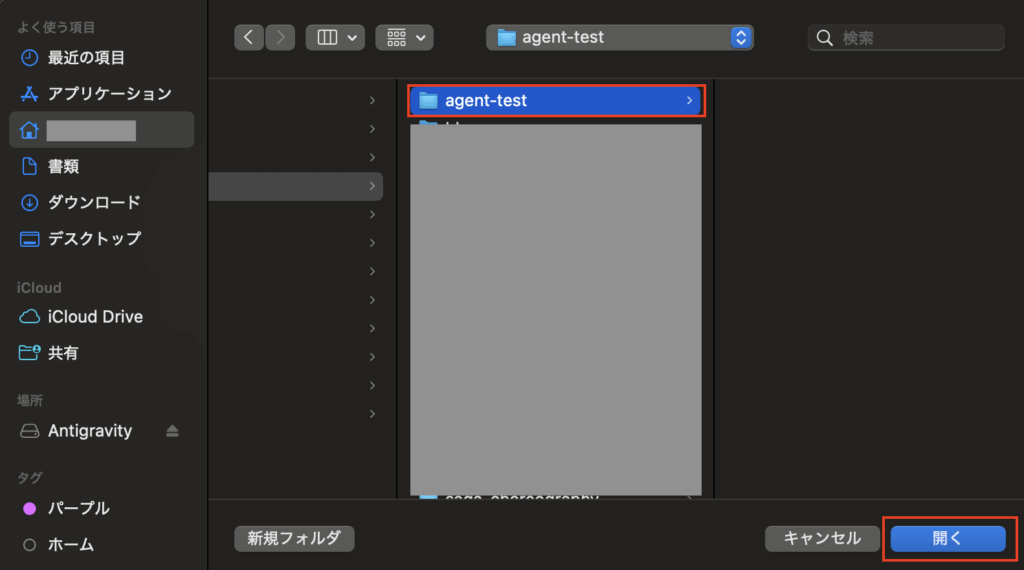 次にフォルダ選択画面が表示されるので、指定のディレクトリにフォルダ「agent-test」を新規作成後、選択して「開く」をクリックします。
