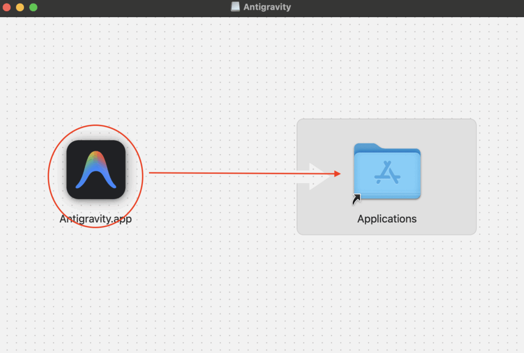 次に画面左の「Antigravity.app」を右の「Applications」にドラッグ&ドロップしてインストールします。