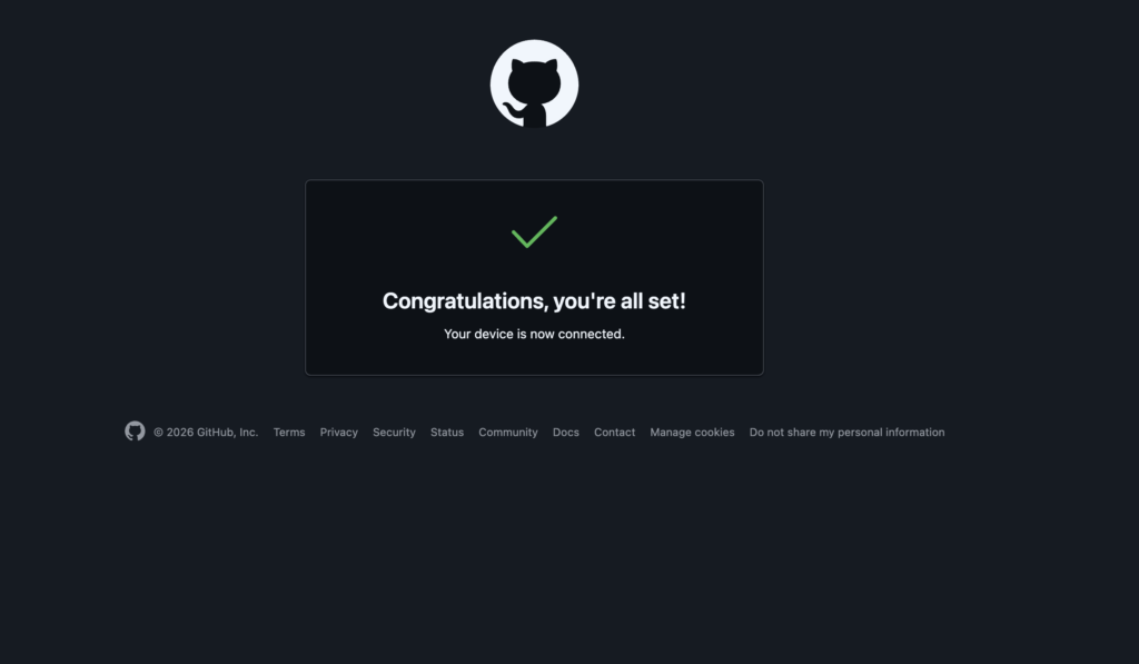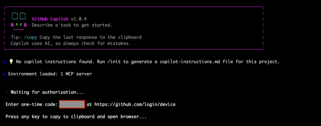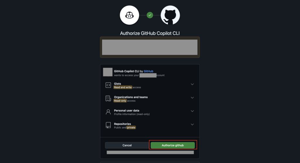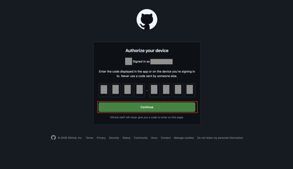次にログにワンタイムコードが表示されるので確認し、何かのキーを押すとブラウザでGitHubの画面が開きます。