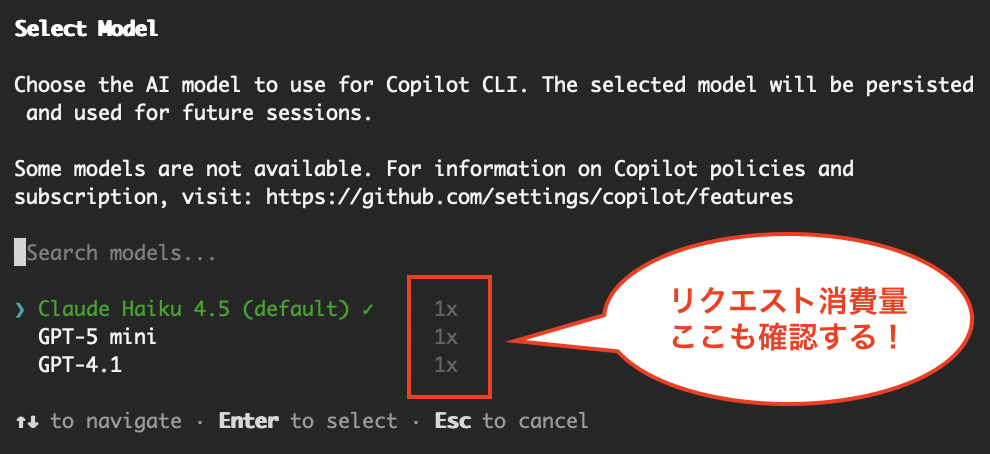次にAIモデルの選択画面が表示され、デフォルトのAIモデルやモデルごとのリクエスト消費量(1xならリクエスト1回分消費)も確認できます。