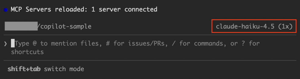 尚、ターミナルの入力画面の右側にも選択中のAIモデルが表示されていて確認できます。