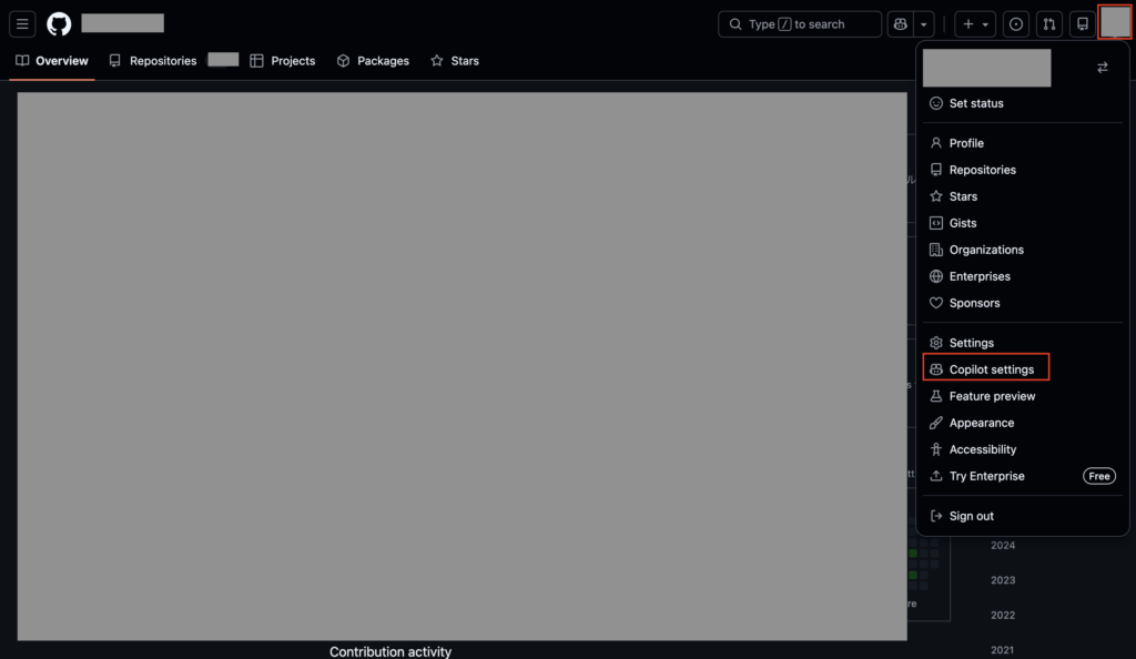 この設定をオフにしたい場合は、GitHubアカウントの画面を開いて右上のアイコンからメニューを開き、「Copilot settings」を選択します。