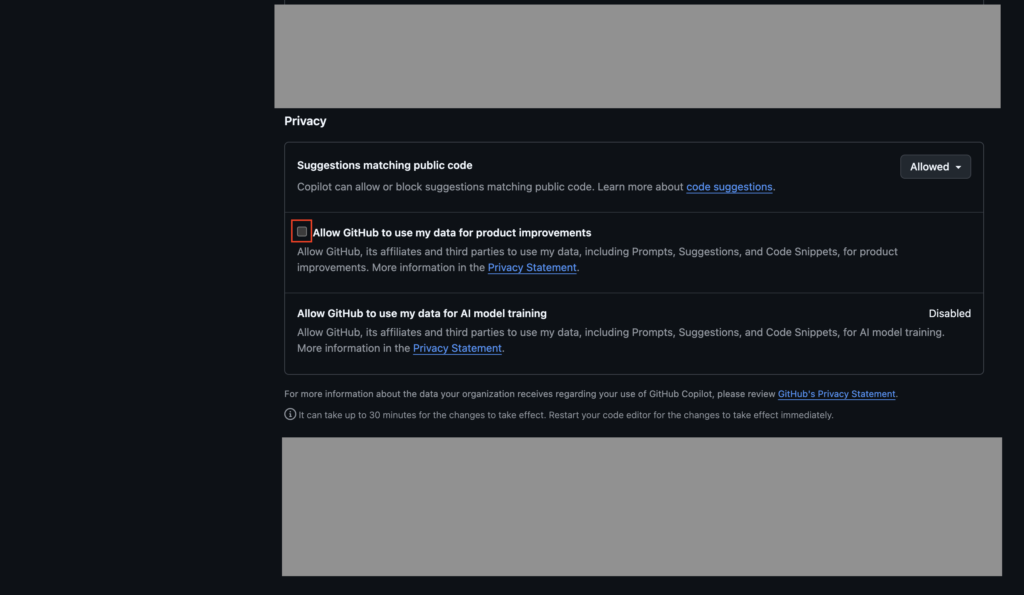 次にGitHub Copilotの設定画面が開き、画面下にプライバシー設定の項目があるので、その「Allow GitHub to use my data for product improvements(GitHubに自分のデータを製品改善のために使用することを許可する)」のチェックを外して下さい。