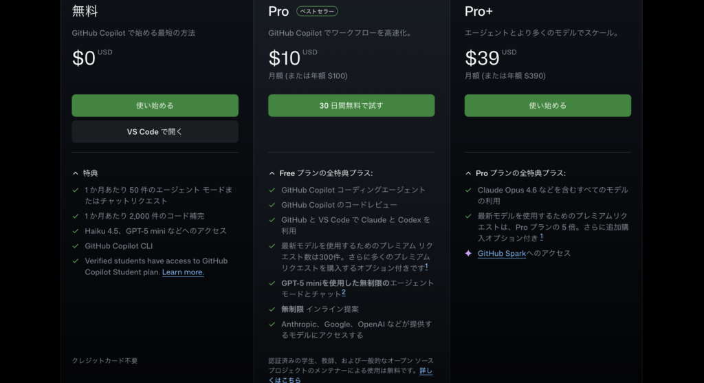 尚、学生や教員、およびOSSのメンテナーの方については、GitHub Educationに登録して認証が通れば、Copilot Proプランを無料で使えるようです。