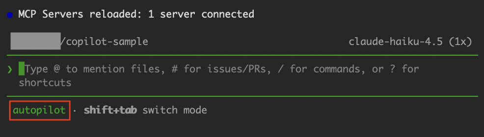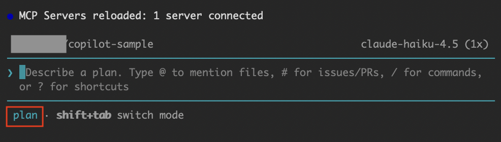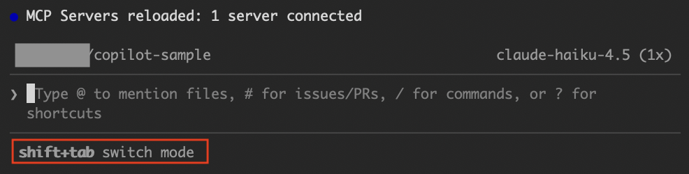 GitHub Copilot CLIでは主に3種類のモードがあり、デフォルトではチャットモードですが、ショートカットキー「shift + tab」でモード切り替えが可能です。
