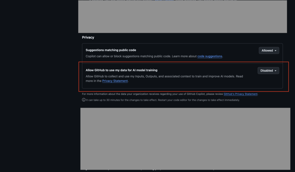 入力内容をAIモデルの学習に使うかの設定が、プライバシー設定にある「Allow GitHub to use my data for AI model training(GitHubがAIモデルのトレーニングのために私のデータを使用することを許可する)」に集約され、デフォルトでは「Enabled(有効)」に変更されました。