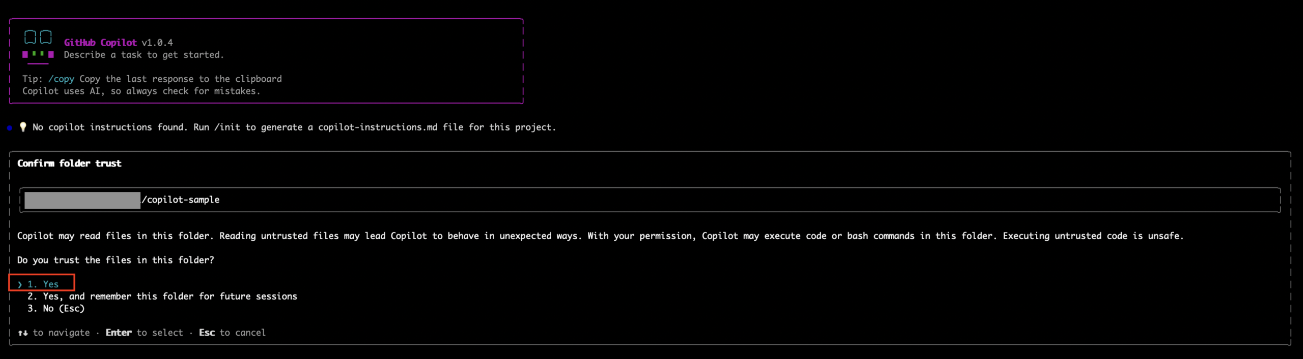copilot起動後、対象のフォルダを信用するかを聞かれるので、「Yes」を選択します。