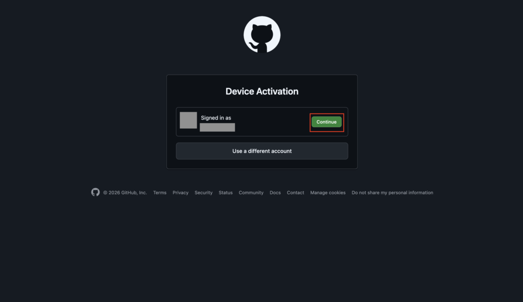 次にGitHubアカウントで認証する必要があるため、以下のコマンドを実行します。