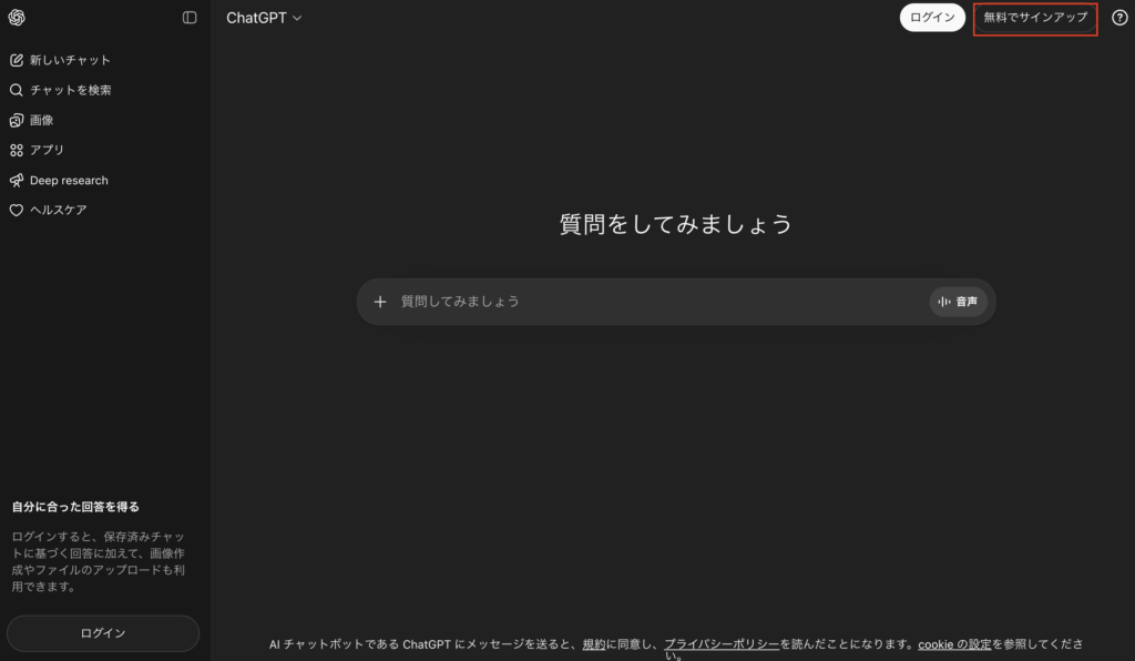Codex CLIやCodexアプリを利用するには、まずChatGPTのアカウント作成が必要になるため、ChatGPTの公式サイトにアクセスして画面右上にある「無料でサインアップ」をクリックします。