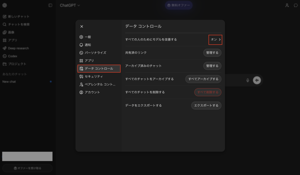 ChatGPTで入力内容をAIモデルの学習に使われないようにする方法については、設定画面のメニュー「データコントロール」にある「すべての人のためにモデルを改善する」から変更できます。(デフォルトはオンになっています。)