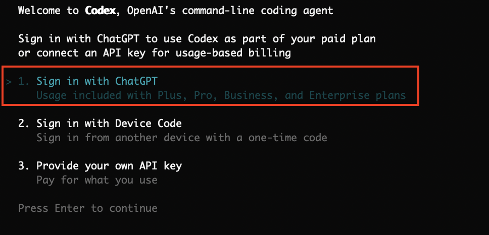 上記で作成したChatGPTアカウントを利用する場合は、「1. Sign in with ChatGPT」を選択します。