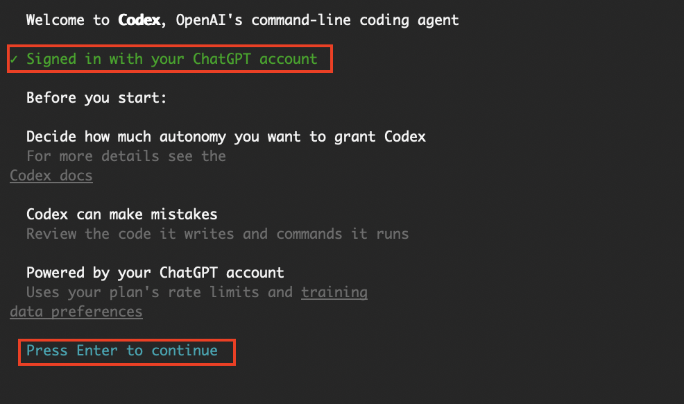全て完了すると以下のような表示になり、Codex CLIを利用できます。