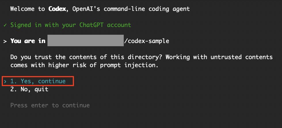 次に作業ディレクトリを信用してよいか聞かれるので、問題なければ「1. Yes, continue」を選択します。