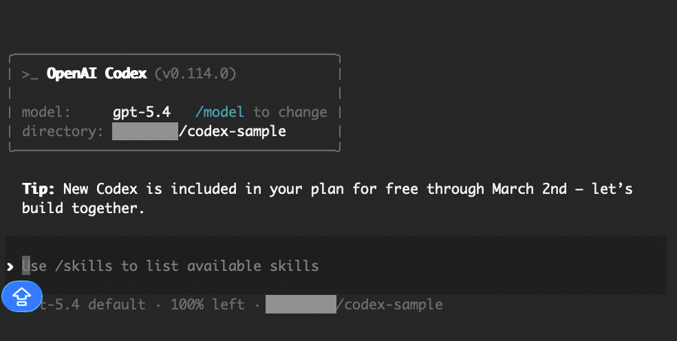 デフォルトではGitリポジトリである必要があるため、まだGitリポジトリにしていないディレクトリで実行したい場合は、オプション「–skip-git-repo-check」を使います。
