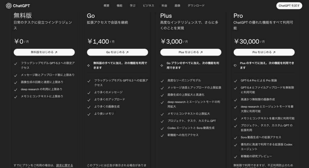 詳しくはChatGPT公式の価格設定ページをご確認下さい。