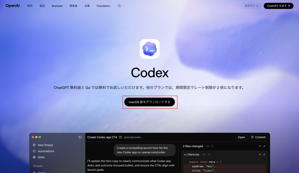 次にCodexアプリを使いたい場合は、OpenAI公式サイトのCodexアプリのページなどからダウンロード可能です。