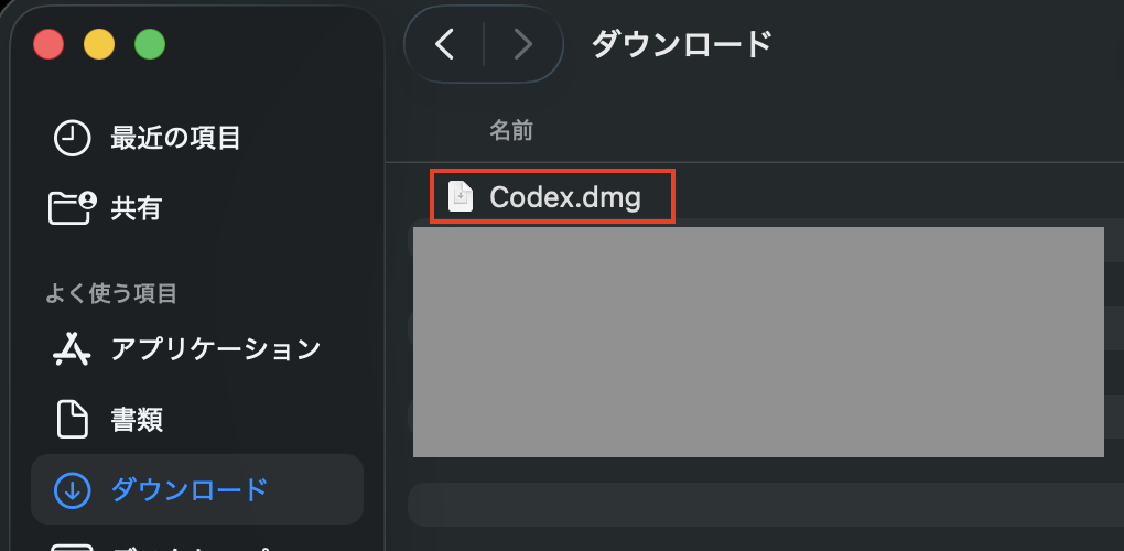 Codexアプリのダウンロード後、MacOSの場合は「Codex.dmg」をクリックします。