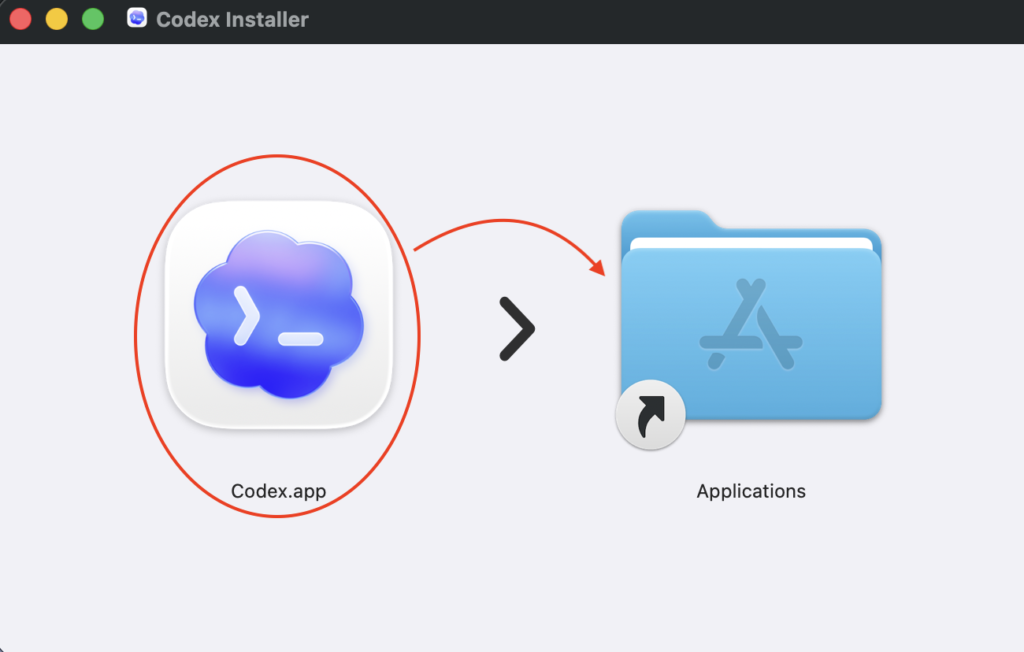 次にCodexアプリのインストーラーが表示されるので、Codex.appをApplicationsフォルダへ移動します。