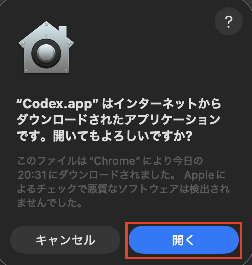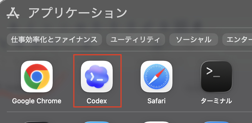 Codexアプリのインストール後、アプリケーションに「Codex」アイコンがあるのでクリックして起動します。