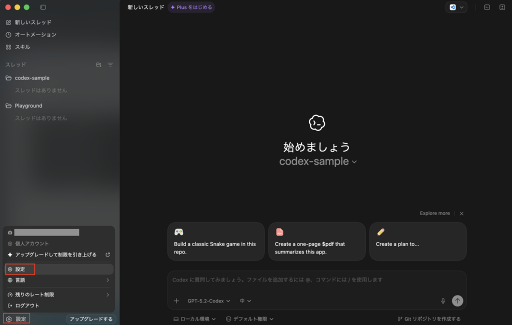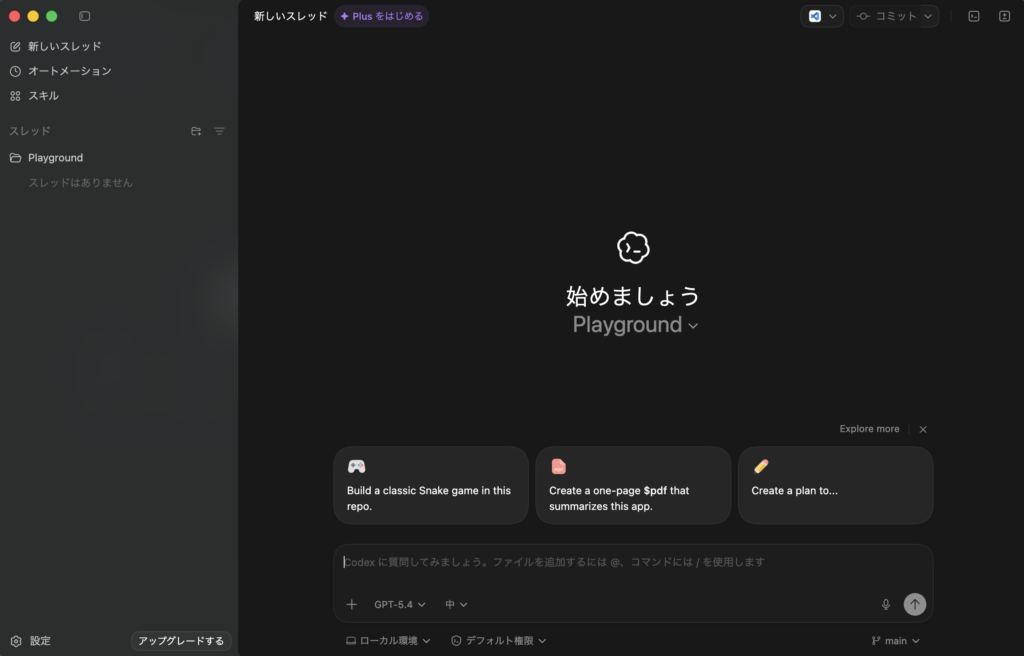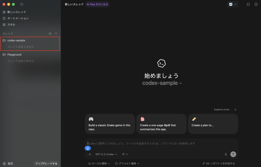 これで以下のようなCodexアプリの画面が表示されて利用可能です。