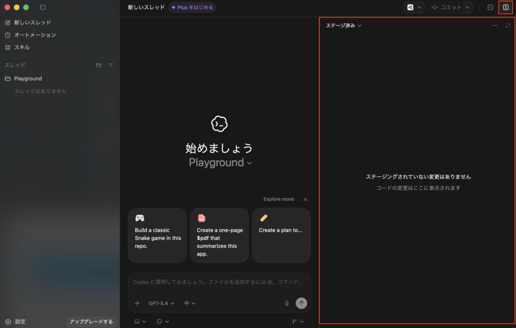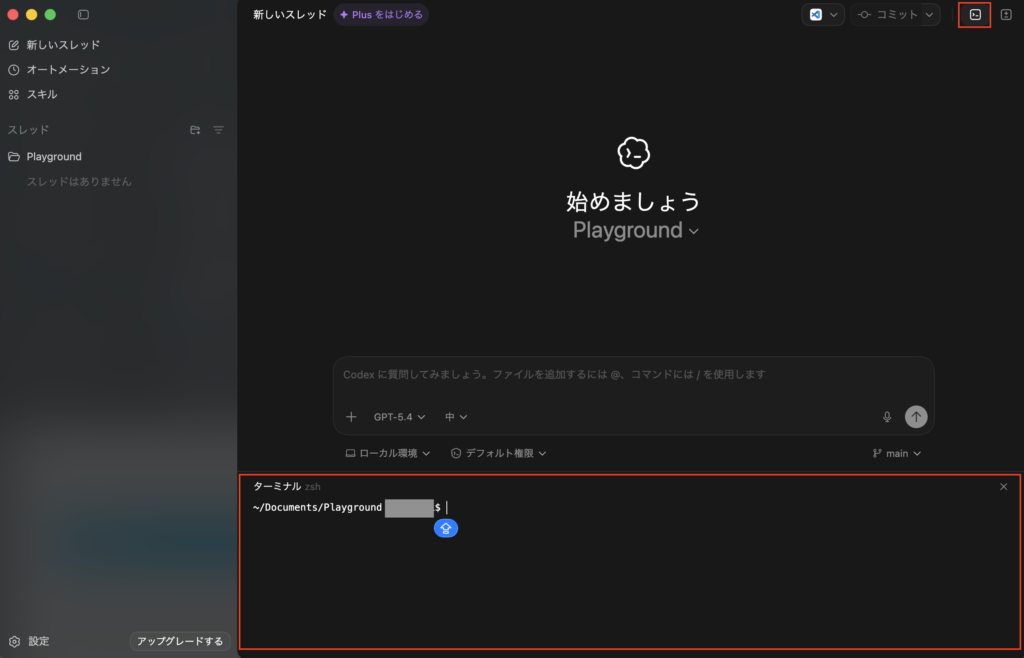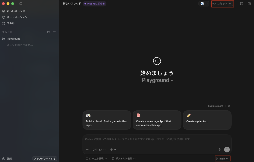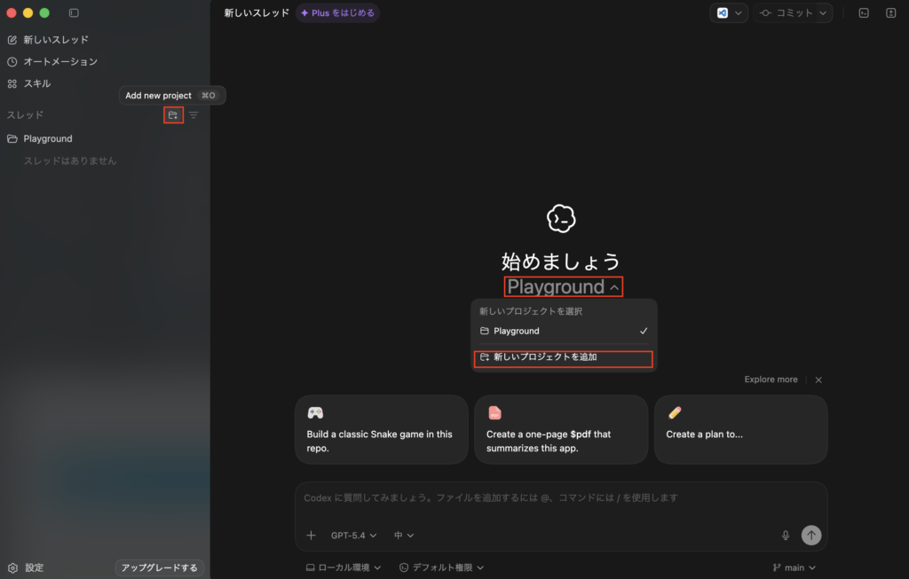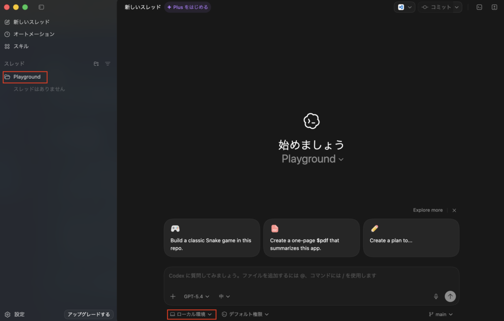 Codexアプリの画面について、デフォルトではローカル環境(MacOSの場合は「~/Documents/Playground/」が作成)にPlaygroundディレクトリが作成されて設定されています。