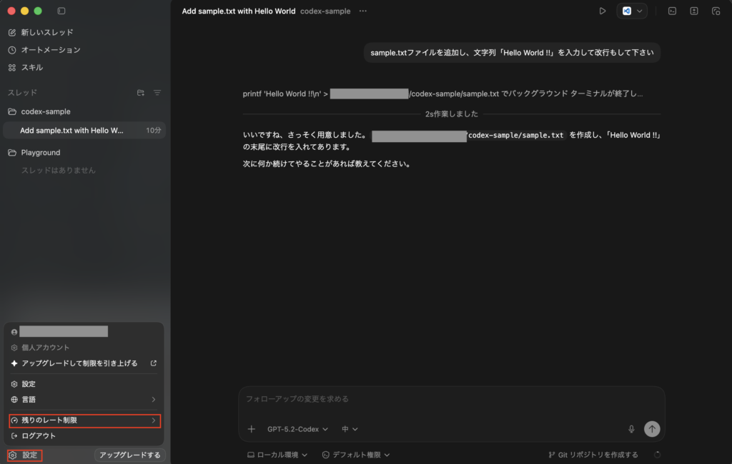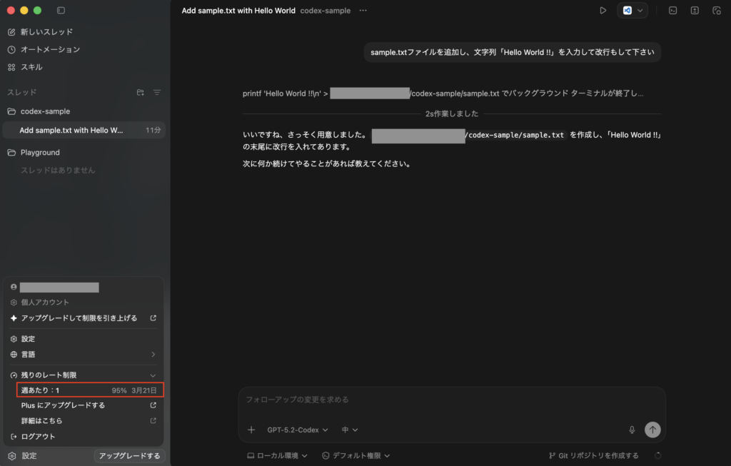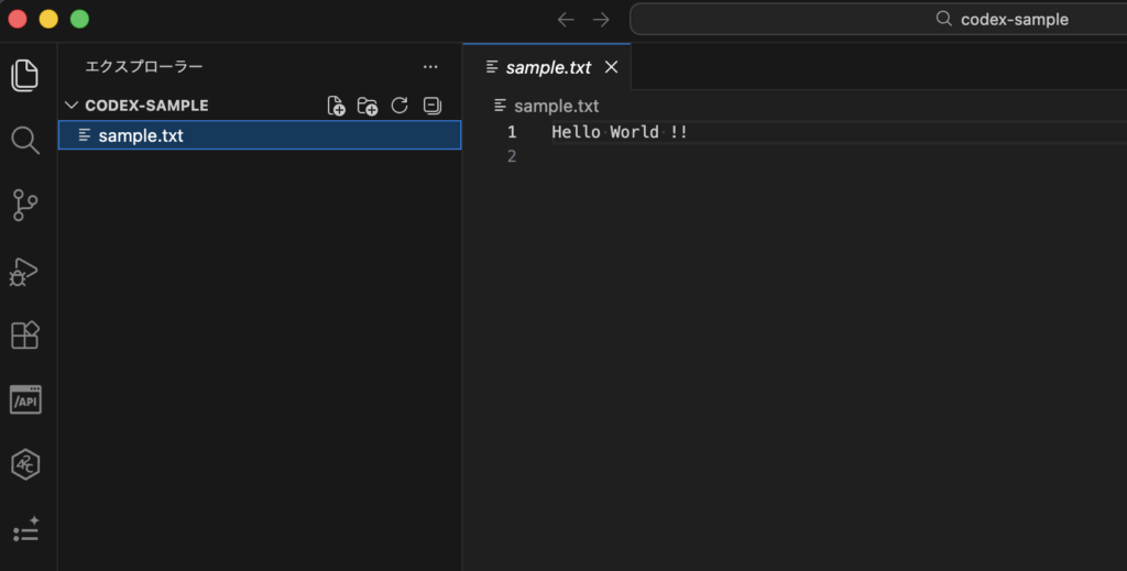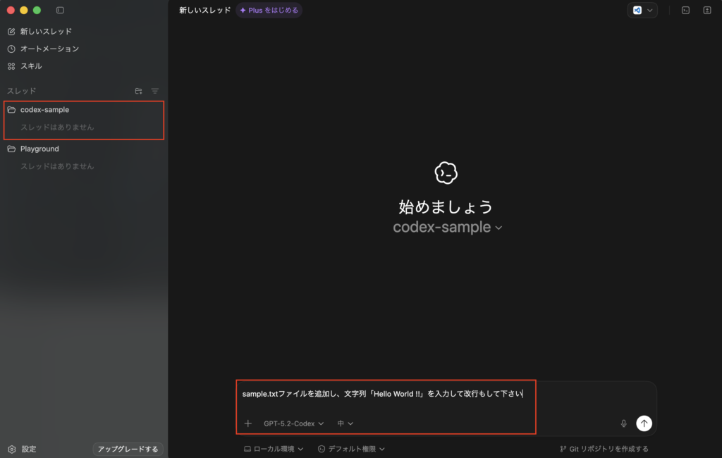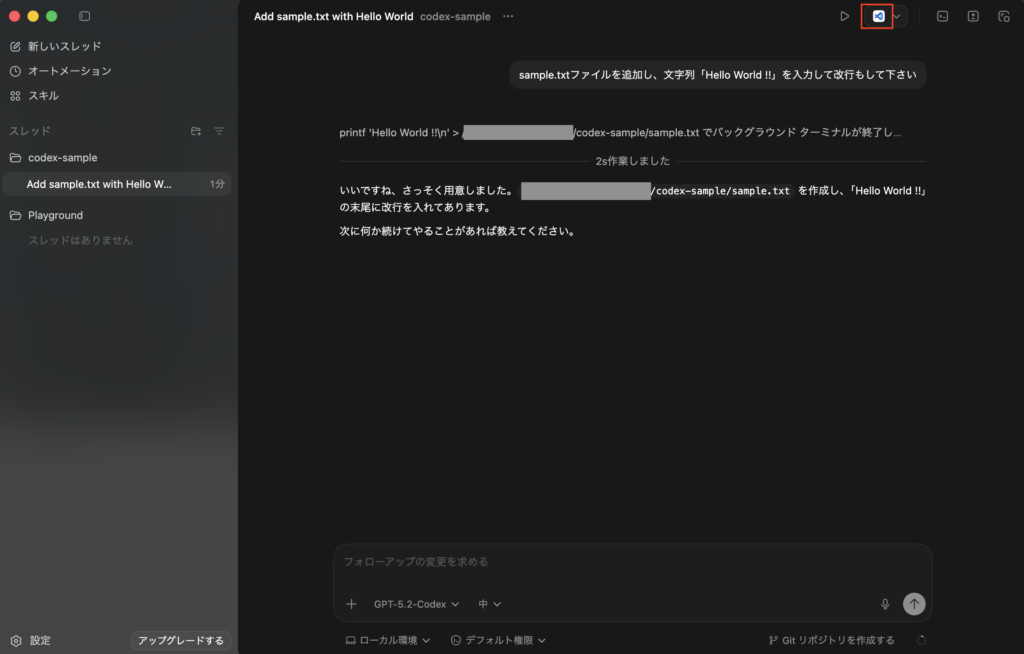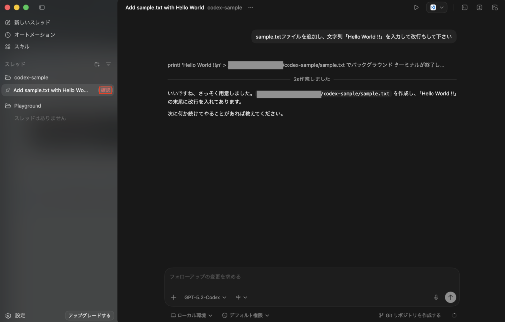 まず事前に作成済みの「codex-sample」ディレクトリを開き、入力欄で利用できるAIモデルに変更後、プロンプトとして「sample.txtファイルを追加し、文字列「Hello World !!」を入力して改行もして下さい」を入力して実行してみます。