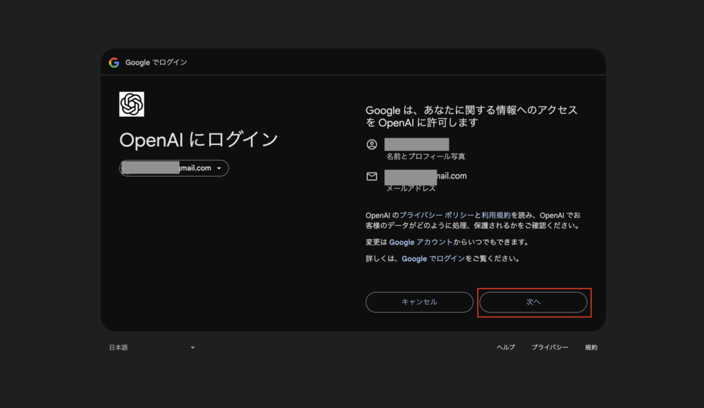 次にログイン許可画面が表示されるので、「次へ」をクリックします。