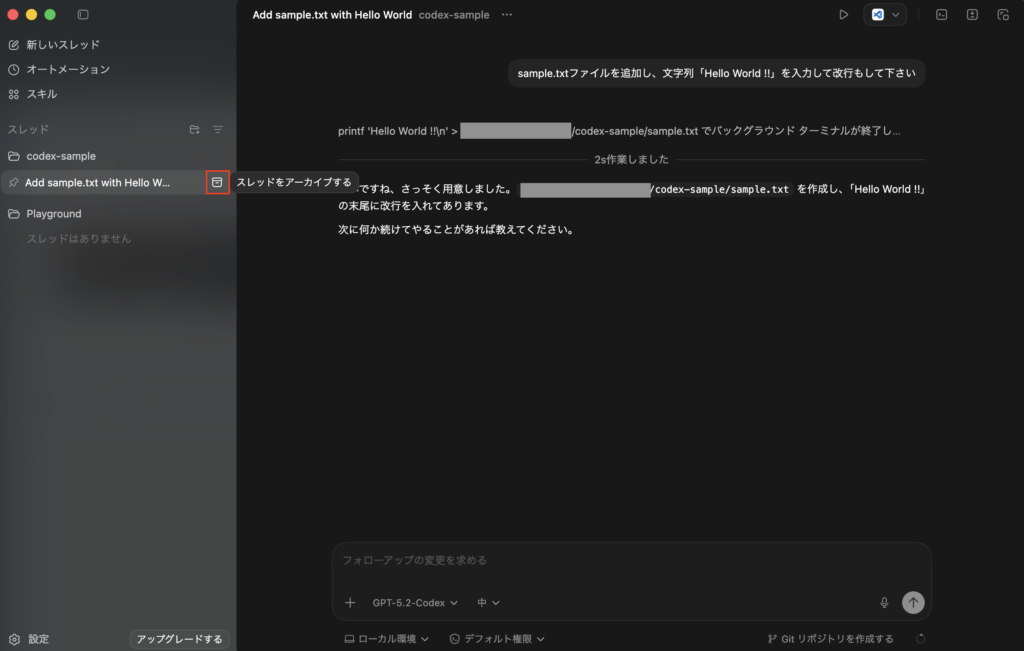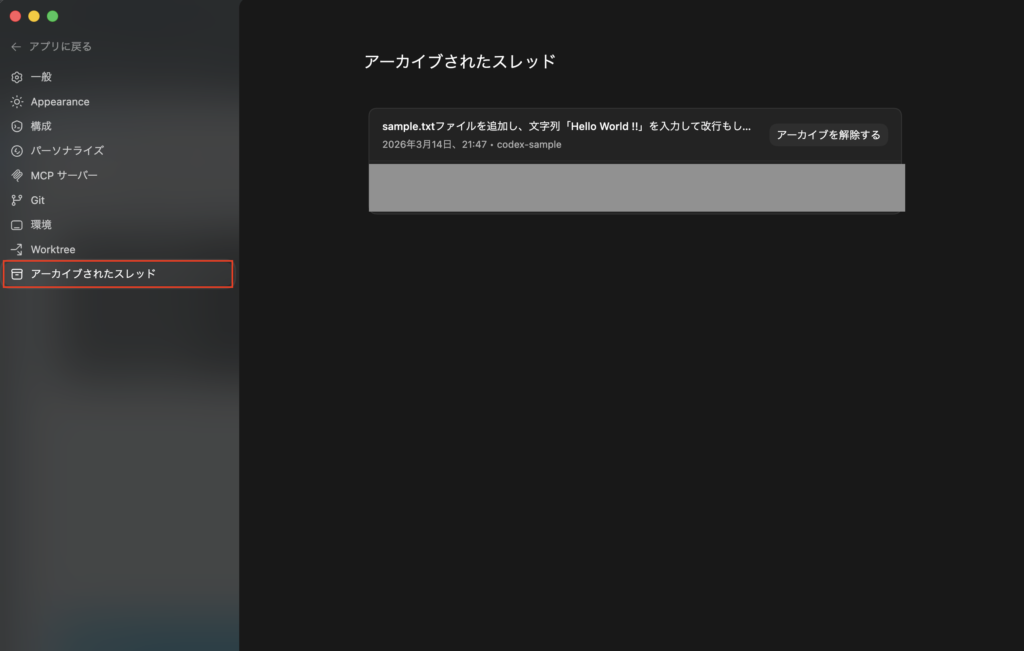 Codexアプリではスレッド単位で処理をするため、処理が終わって不要なスレッドはアーカイブすることが可能です。