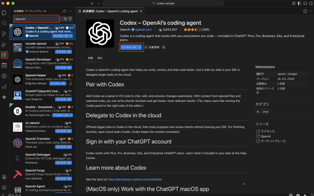 テキストエディタにVSCodeを利用していて、VSCodeからCodexを利用したい場合は、拡張機能「Codex – OpenAI’s coding agent」も利用可能です。