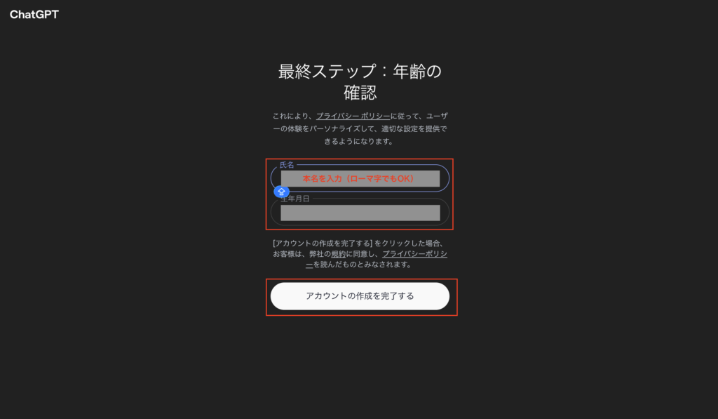 次に氏名(規約では本名を入力する必要があるようです。ローマ字でもOKみたいです。)と生年月日を入力し、「アカウントの作成を完了する」をクリックします。