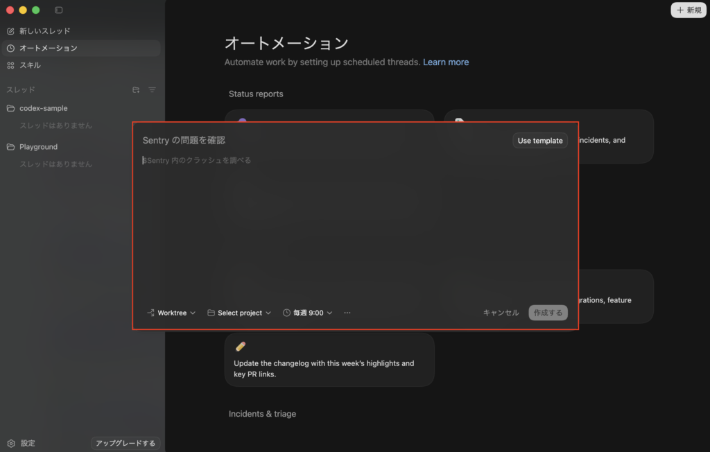Codexアプリにはサイドバーのメニューにオートメーションがあり、これを使うとタスクをスケジュール登録して定期実行させたりできます。