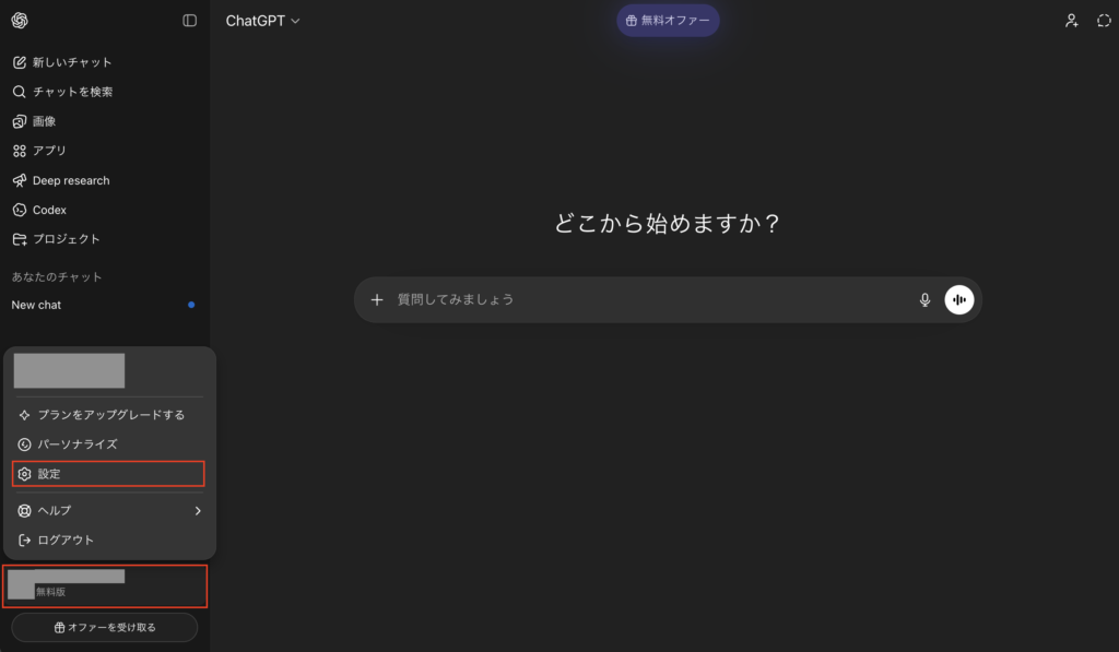 ChatGPT用の設定画面を開きたい場合、画面左下のアカウト部分をクリックし、メニューにある「設定」をクリックします。