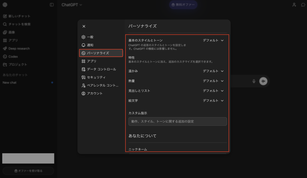 ChatGPTでは返答のスタイルなどのパーソナライズ設定も可能で、設定画面のメニュー「パーソナライズ」から変更できます。